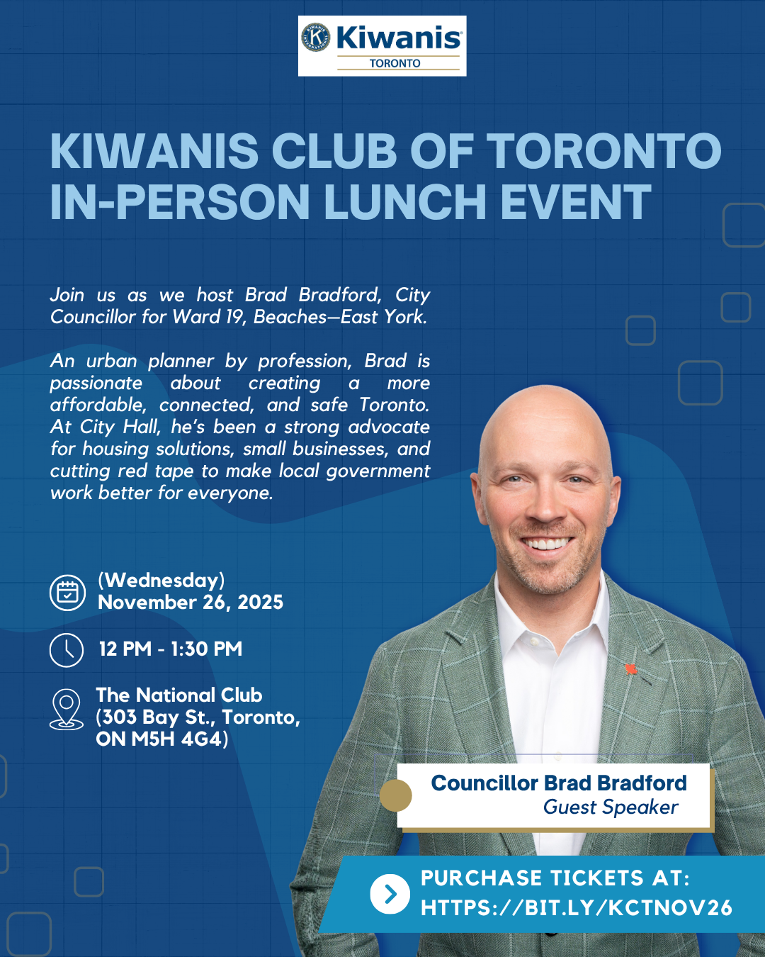 The National Club 303 Bay Street, Toronto, Ontario, CanadaJoin the Kiwanis Club of Toronto for our in-person luncheon on Wednesday, November 26, 2025, featuring Brad Bradford, City Councillor for Ward 19 – Beaches–East York. Brad will share hisContinue reading "Kiwanis Club of Toronto Lunch Event with Councillor Bradford"