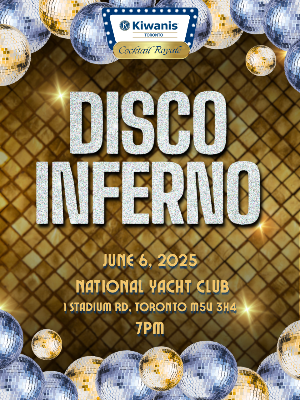 Join us on June 6, 2025 at the National Yacht Club for Cocktail Royale: Disco Inferno — a dazzling celebration of the 2025 Kiwanis Club of Toronto Foundation grant recipients.Continue reading "Kiwanis Cocktail Royale: DISCO INFERNO"